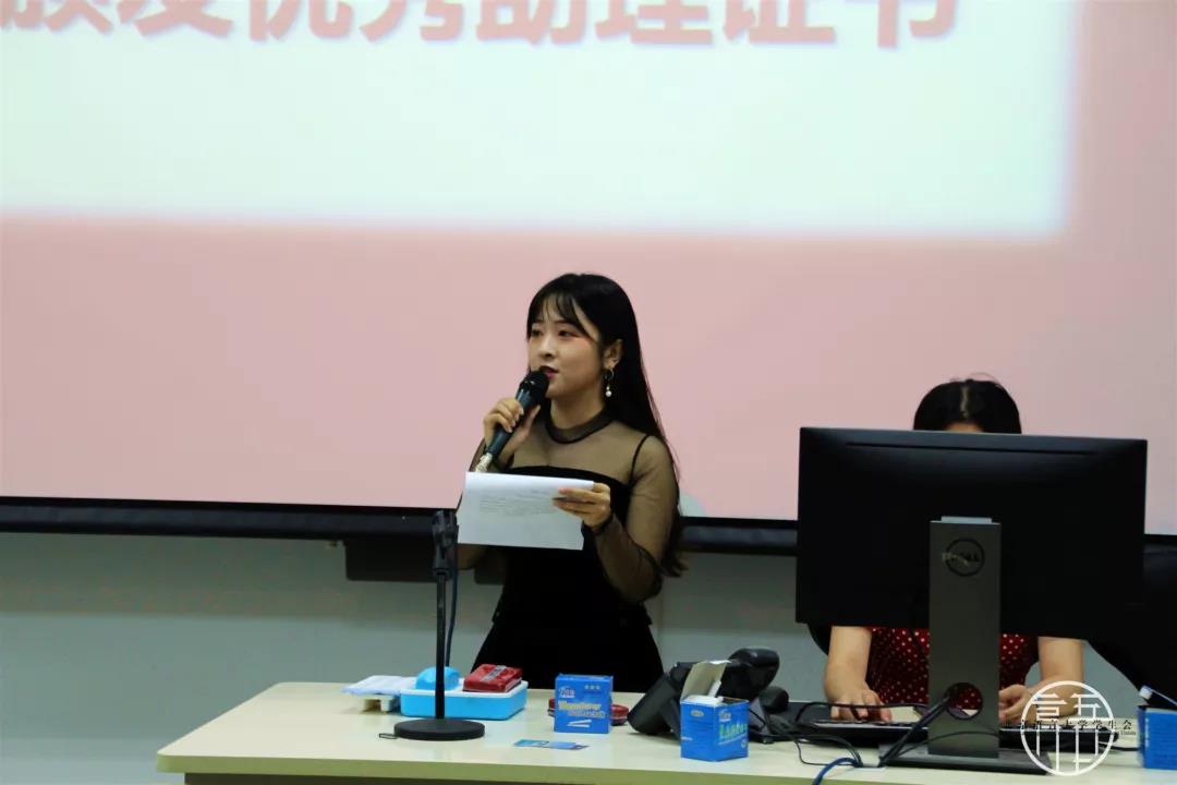 在学生会副主席金钰佳的主持下,本次会议正式开始。校歌奏毕,付劲涛、李欣悦、赵蔚玮三位副主席为学生会优秀助理颁发证书。