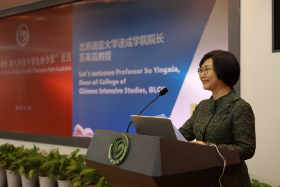 苏英霞教授代表北京语言大学汉语速成学院感谢孔子学院总部和维州教育培训部的信任和大力支持,对各位澳方随队教师、汉语速成学院汉语老师和志愿者团队给予高度赞扬,她希望此次秋令营能极大加深同学们对传统中国和现代中国的了解。苏英霞教授指出,汉语速成学院的教学和管理团队结合北语汉语教学优势,针对中学生特点,巧妙地将汉语速成学院的强化语言教学和文化实践活动融合在一起,在提高学生汉语听、说、读、写能力和加深他们对中国文化的了解与理解方面都取得了十分显著的教学效果。本期秋令营活动内容丰富多彩,分为汉语课程、文化参访、文化体验活动、实地考察语言实践、中澳学生交流、社会文化讲座等几大板块,采用任务式教学方法,特别是中国文化及文化参访环节,与汉语课和社会文化讲座紧密结合、环环相扣,在实地考察环节尤为注重对小营员们汉语实际应用能力的培养。苏英霞教授向澳方营员表示,“国之交,在于民相亲;民相亲,在于心相通”,希望在坐的小营员能成为中澳民间友好往来的使者,共同搭建中澳友谊的桥梁。