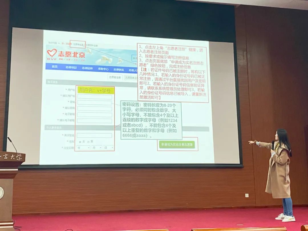 为了让同学们对志愿服务时长的了解更加清晰,志愿者权益管理中心的工作人员们对志愿北京注册等很多常见问题进行了详细的讲解,如“一直没有志愿者编号怎么办”、“用户名怎么填写”、“注册志愿北京后实名认证很长时间通过不了怎么办”。