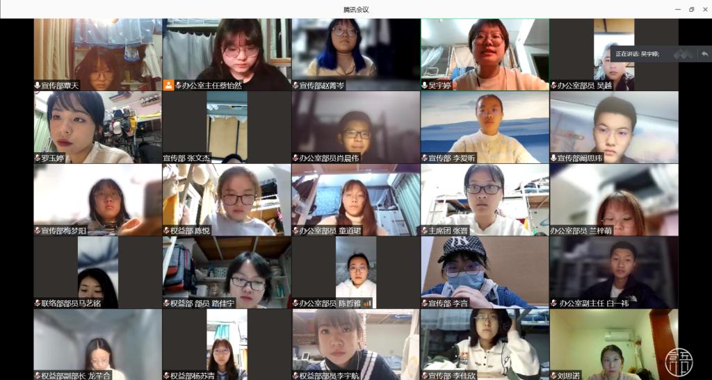 主席团成员吴宇婷首先引用习总书记的讲话内容强调了本次学习的重要意义,随后办公室主任蔡怡然为大家播放了两段学习视频。第一个视频是来自CCTV—7国防军事频道的《纪念中国人民志愿军抗美援朝出国作战70周年大会在京隆重举行 习近平发表重要讲话》。视频通过节选习近平总书记在会上的重要讲话,让大家认识到了我们要铭记抗美援朝战争的艰辛历程和伟大胜利,弘扬伟大的抗美援朝精神,并将这种刻苦奋斗的意志落实到生活中。第二个视频是《高燃 公辞七十载,今夕请当归》。视频节选抗美援朝战争影像,并配以英雄先烈们的铮铮誓言。参会成员通过视频了解了英雄先烈们的传奇故事,回顾学习了志愿军光辉的奋斗历史。联络部王静波同学分享学习心得,她讲道:“我们应当缅怀先烈,不忘历史,铭记英雄们的珍贵事迹,学习先烈们的奋斗精神。”参会的同学们也纷纷就本次学习发表感想。