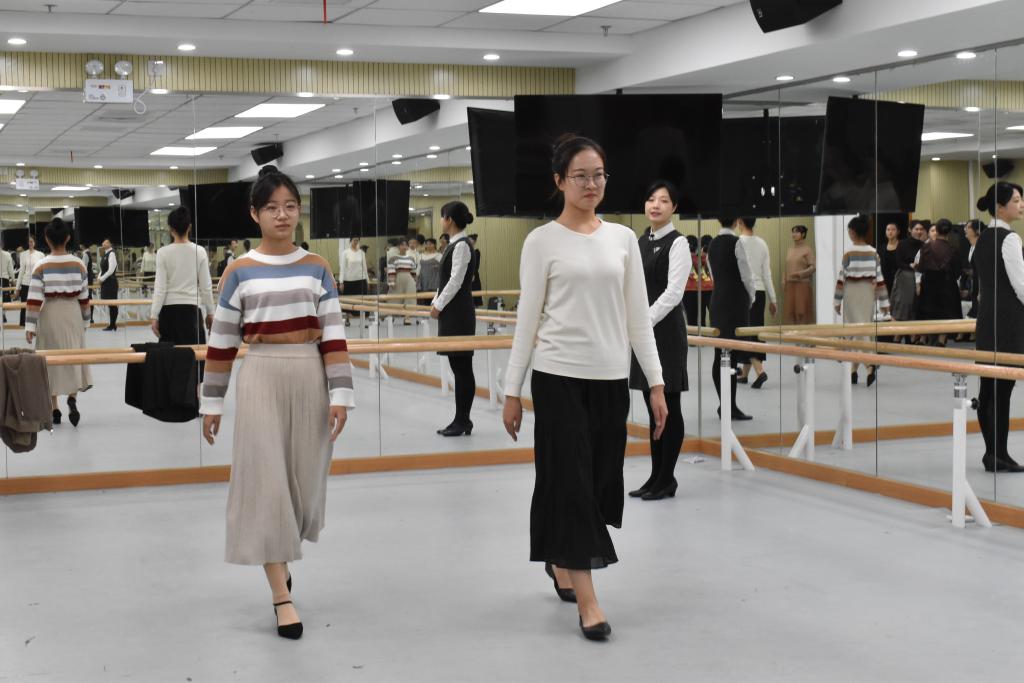 郑老师进行了礼仪基本手势、站姿、坐姿、走姿以及蹲姿的教授,并帮助同学们一一纠正。例如在礼仪接待时,女生应双手五指并拢,保持右手在上、左手在下,高度合适的手位,关节位置有一定弯度;双脚或并拢,或v字站立,或丁字站立,面带微笑,双肩下压,不可晃动;左侧入座、左侧出,上半身挺直,扶裙时注意仪态;双臂自然前后摆动,双脚脚跟踩在一条线上;或高低式蹲姿,或交叉式蹲姿。
