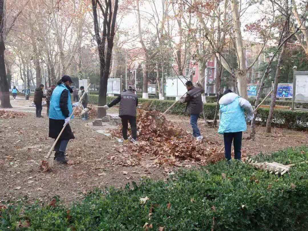首先,志愿者们在各位老师的指导下,将均匀分散在草坪上的落叶用耙子扫到一处,收集起来,等待之后统一装袋。朔风凛冽,但志愿者们不畏寒冷,认真清扫着落叶。他们带着手套,耐心细致地将角落里的落叶扫出来。即使偶有遗漏,或是有边角难以顾及,也总会有其他的志愿者帮忙,将落叶彻底清理干净。在所有人的齐心协力之下,草坪上的落叶很快就被打扫干净了。