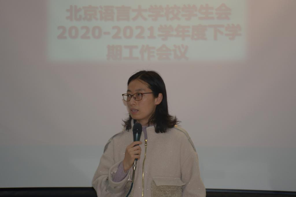 3月26日中午,北京语言大学学生会新学期工作大会在主南200顺利召开。校团委副书记张晴老师出席会议。学生会全体成员参加本次大会。办公室主任蔡怡然主持会议。