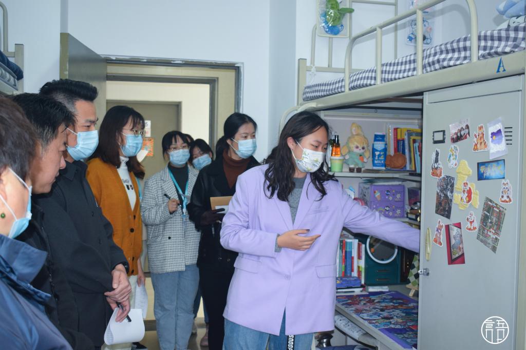 考察团按照防疫要求测量体温之后,在校学生会权益部工作人员的带领下一一进入宿舍楼参观晋级寝室。各寝室的同学们通过精彩的介绍,展示了寝室的特色和风格,并分享了各自难忘的宿舍回忆。老师们亲切地与寝室成员交流,现场气氛温馨愉快。