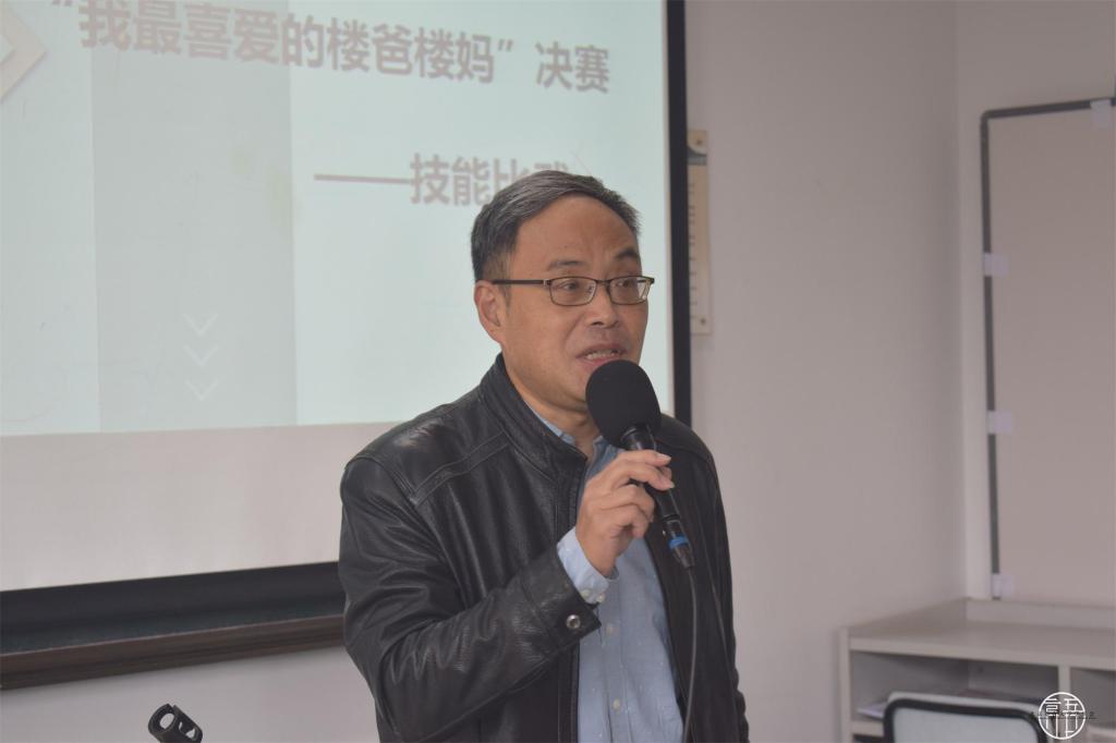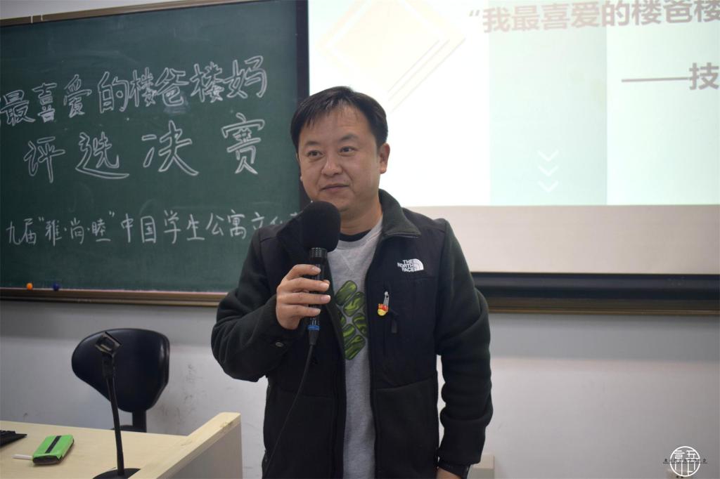 随后,校团委杨天乔老师发表了讲话。他首先指出:楼爸楼妈队伍的日益壮大,从侧面反映出宿舍管理在学生工作中的重要性逐渐凸显。楼爸楼妈技能“比武”活动持续九年的成功举办,也说明公寓文化节能够反映同学诉求、切实解决问题、推进公寓建设。同时他指出,“我最喜爱的楼爸楼妈”活动是一项不忘初心的活动——楼爸楼妈不忘初心,坚持为同学们服务;同学们不忘初心,输入新的建议,创新活动设计,用真情和行动回馈母校;各组织部门不忘初心,“心往一处去,劲往一处使”,相互配合,力求更好地完成各项学生工作。最后杨天乔老师祝愿楼爸楼妈身体健康、工作顺利,也预祝本次评选活动圆满结束。