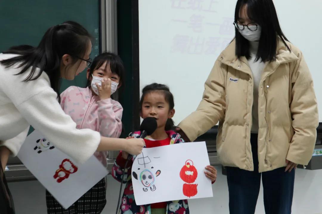 19:30,活动进入了绘画环节。拿到工具后,大家都专注地投入到创作当中,绘出自己心中所想。在志愿者的帮助下,小朋友天马行空的想象在一幅幅画作中徐徐展现:可爱的皮卡丘,彩虹下的房屋,星空中的月亮,冰墩墩和雪容融……半个小时后,孩子们迫不及待地排队上台展示作品。有的小朋友略带羞涩地向大家介绍着画中的内容和其中的故事;有的小朋友则热情大方地讲着自己画中的人物,随后又向大家推荐他的小老师的画作,还不忘鼓励对方一番,率真模样令全场忍俊不禁,现场掌声不断。