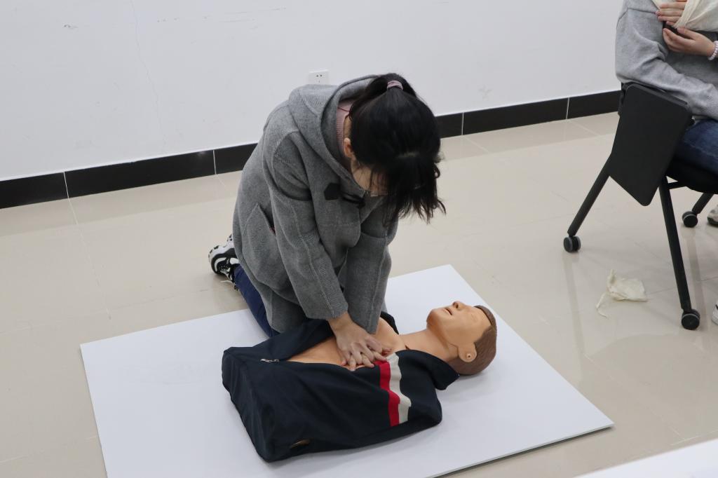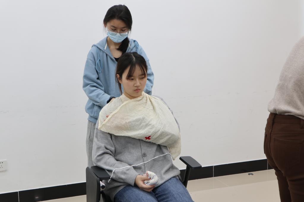 在现场救护技术(止血与包扎)的考核过程中,参赛志愿者熟练地按照老师们提出的要求进行手部、肘部、头部的包扎,在包扎的过程中,不断地询问伤者的感受并安慰、鼓励伤者。志愿者根据伤口的不同位置科学地选择包扎方式进行应急救护,展示了螺旋包扎法、人形包扎法、八字包扎法、头部包扎等包扎方法,他们出色的表现得到了老师们的一致好评。