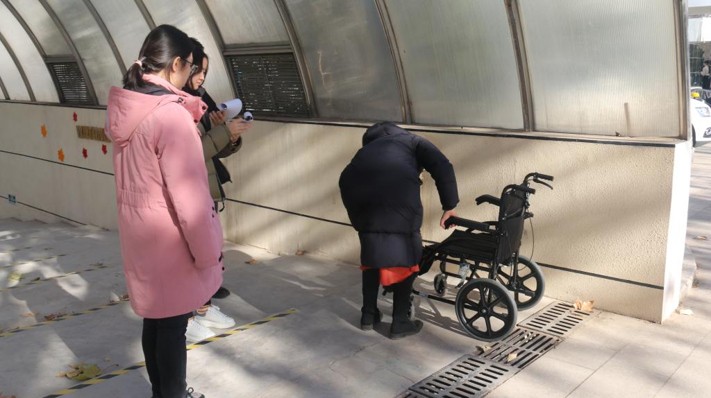 在助行技能(导盲、推轮椅)考核中,志愿者耐心地引导盲者开门、迈过门槛并提醒其地面高度的变化。在志愿者的引导下,盲者顺利地完成了直行、换边、进出门、入座、上下楼梯等基本动作。接下来,志愿者进行了轮椅收放、推行、转弯、上下坡道等考核,并平稳安全地推送残障人士到达目的地。