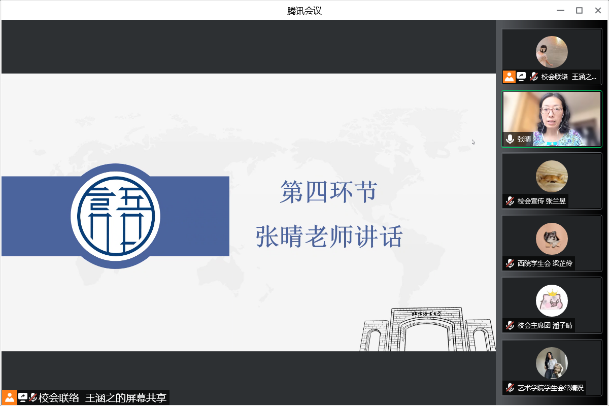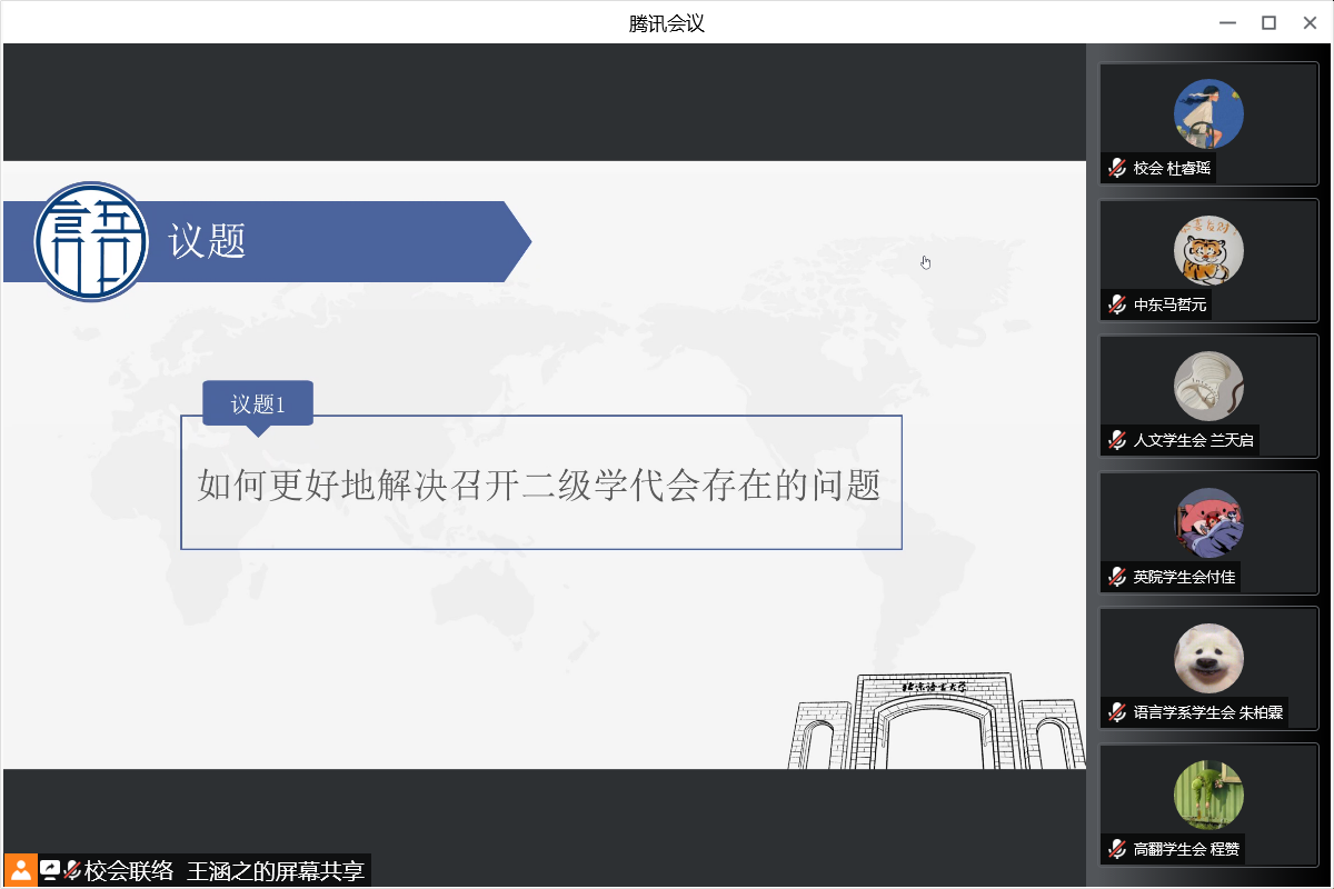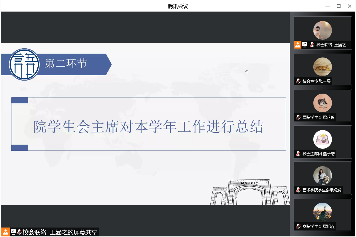 接着,各二级学生会主席对本学期工作进行简要汇报。网课期间,各学部(院、系)学生会步履不停,积极开展各类形式多样、新颖有趣的活动,丰富同学们的居家课余生活。英语学院举办线上考研经验分享会,开展了“单词嘉年华”与“戏剧之夜”等活动;中东学院与埃及苏伊士运河大学进行线上交流,举办阿拉伯语、土耳其语朗读比赛,引导院内各班开展活动;信息科学学院创新性开展“指尖风暴”编程比赛、“胡闹厨房”活动,鼓励同学们在巩固提高专业知识的同时,多学一门生活技能;高翻学院举办留学经验交流会,同时贴近同学生活,提供网课指导和心理疏导;商学院举办第八届营销大赛和文化展演活动,充分调动了商院同学的积极性;语言学系组织同学们学习党史、开展党史微课堂,提高同学们的爱国爱党意识;艺术学院学生会联系学院老师为同学们录制春节祝福视频,与艺术学院校友会合作,将定期开展艺术讲座、艺术沙龙等活动。各院级学生会按照校学生会对二级学生会改革工作的指示,汇报改革进展。各二级学生会开展内部结构调整,沟通班级和院、团、党组织的联系,服务机构精简等工作,并组织召开第一次二级学生代表大会,选举代表参加校级学生代表大会,接下来将召开第二次二级学生代表大会,进行主席团换届选举工作。