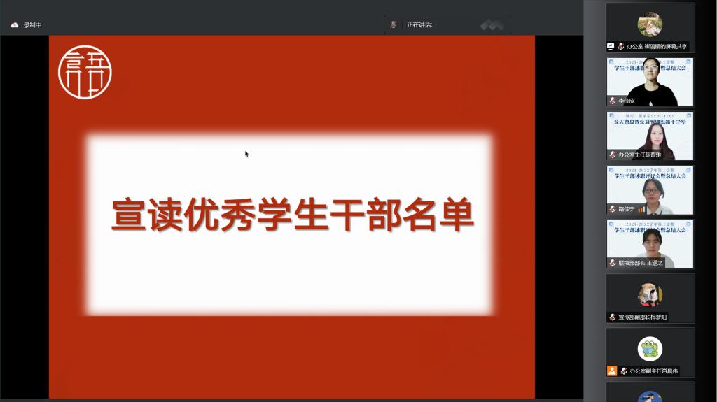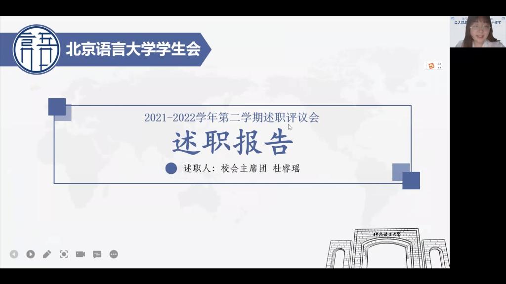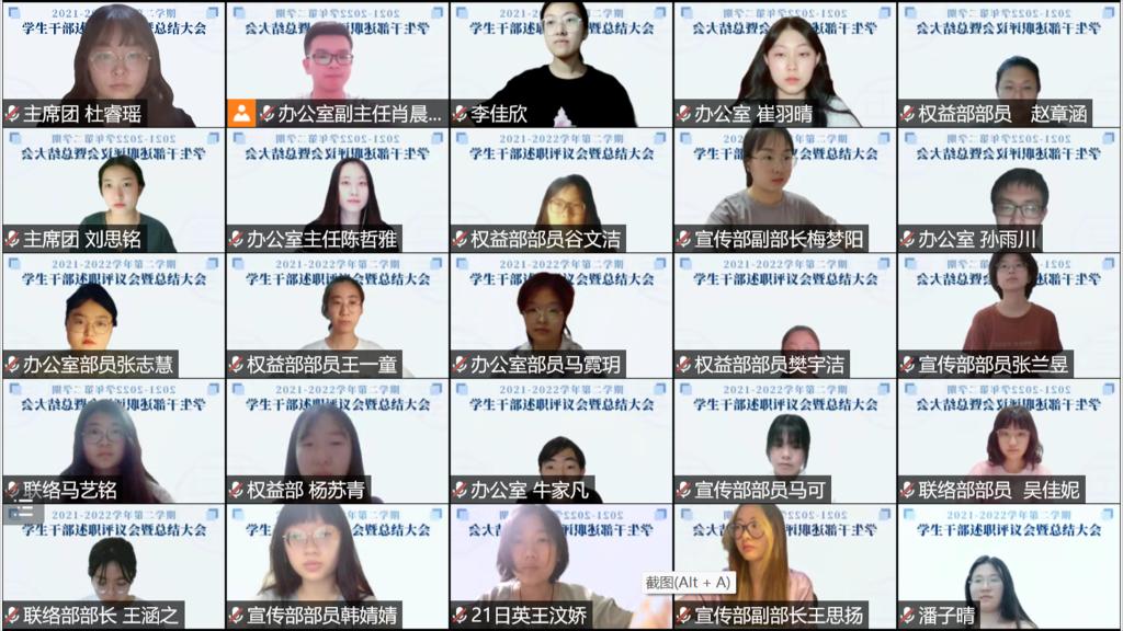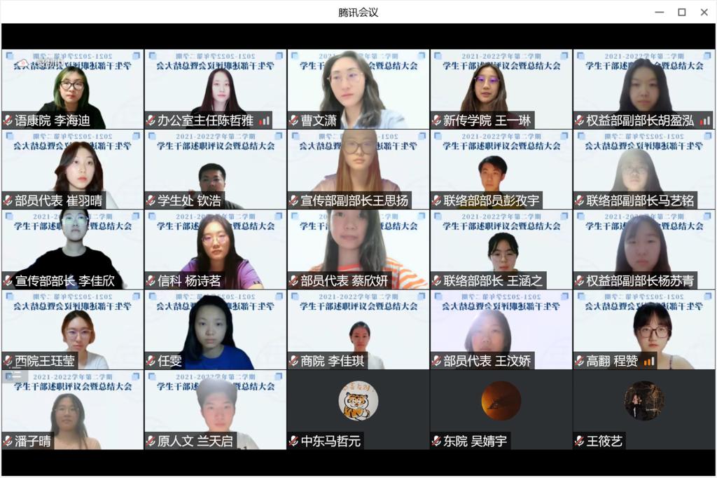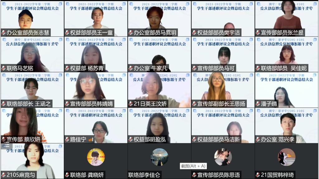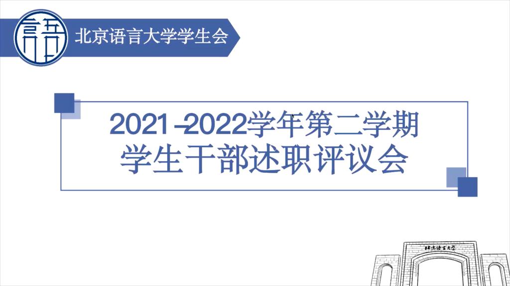晚9时许,本次学生干部述职评议会到此结束。紧接着,晚9时30分,各部门部员陆续到场,北京语言大学学生会2021-2022年第二学期总结大会正式召开,办公室崔羽晴主持本次会议。