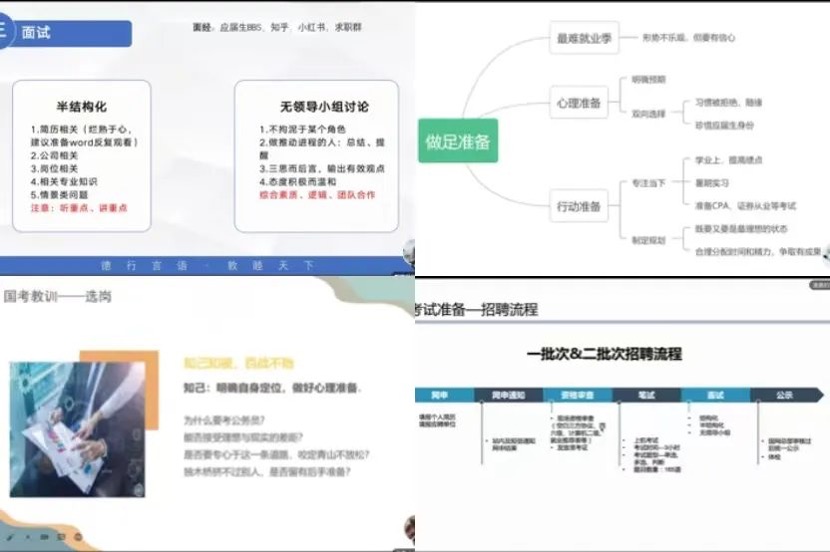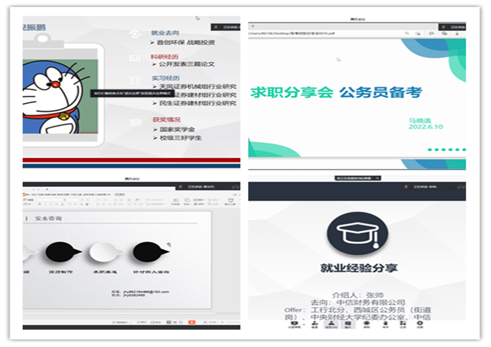 倪镇鹏毕业后将入职首创环保,他通过自己和身边同学的亲身经历,强调了简历的重要性、面试中语言的艺术性和一些回答技巧,建议同学们做好就业安排和方向规划。马晓逸公考上岸,她从求职目标、备考经验、选岗心得、稳住心态四个方面分享了自己的公务员备考心得,内容生动详实。即将就职于安永的蒋华月结合个人经历,分享了简历制作及修改、求职写作、求职渠道和面试以及四大咨询的相关情况和经验。成功拿到中信财务有限公司录用通知的张帅在分享秋招经验时强调一定要明确自己想要什么和能要什么,并建议大家结合求职岗位,分析招聘所需的能力。金可欣毕业后将入职百度,她介绍了互联网领域的行业特点和岗位情况,使同学们对互联网工作有了更多了解,为同学们择业提供了新思路。