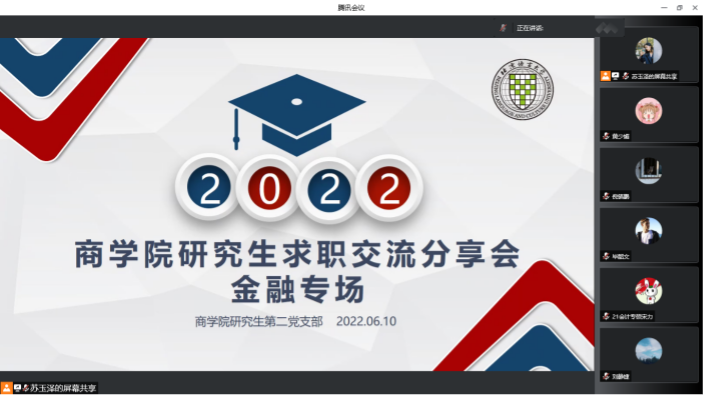 近日,“青年就业记”商学院研究生毕业生经验交流会在腾讯会议平台顺利举行。十位2022届研究生毕业生在交流会上分享了自己的实习和就业经验,并解答了同学们的相关提问。