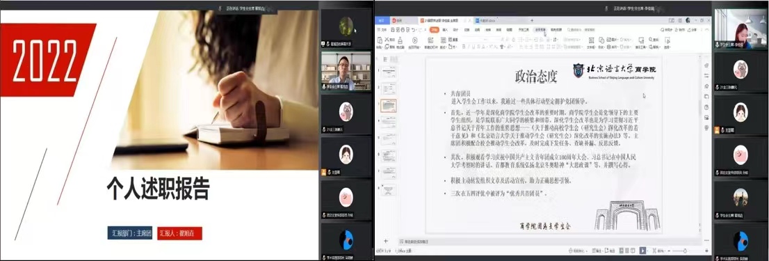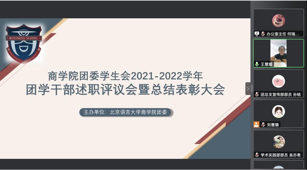 6月17日下午,商学院2021-2022学年团学干部述职评议会暨总结表彰大会通过腾讯会议成功举行。学院团委书记王慧媛老师、辅导员刘慧璐老师出席了本次会议,商学院团学全体成员参会。