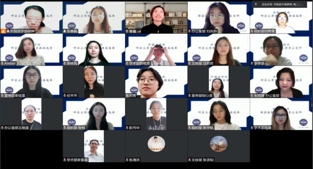 6月23日下午,外国语学部第十二届研究生会换届大会于线上顺利举行,旨在酝酿新一届研究生会团总支主席团和部长人选。学部学办主任曹鑫老师、辅导员李林凤老师、团总支副书记马子萱、研会执行主席郝坤、张春磊,各部门部长及干事出席了此次大会。会议由执行主席郝坤主持。