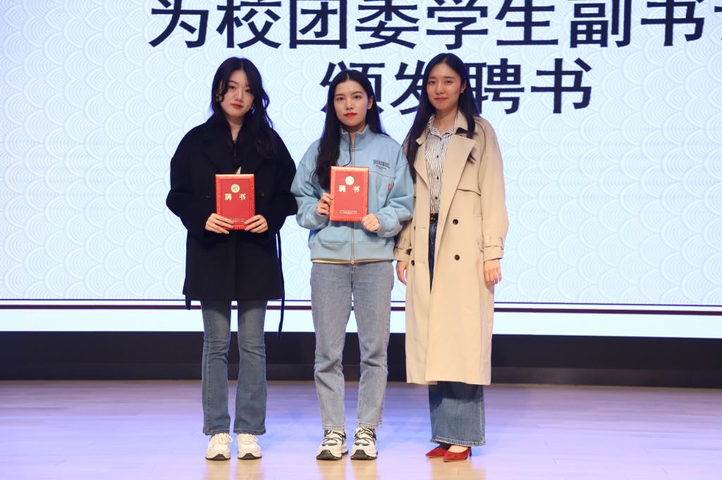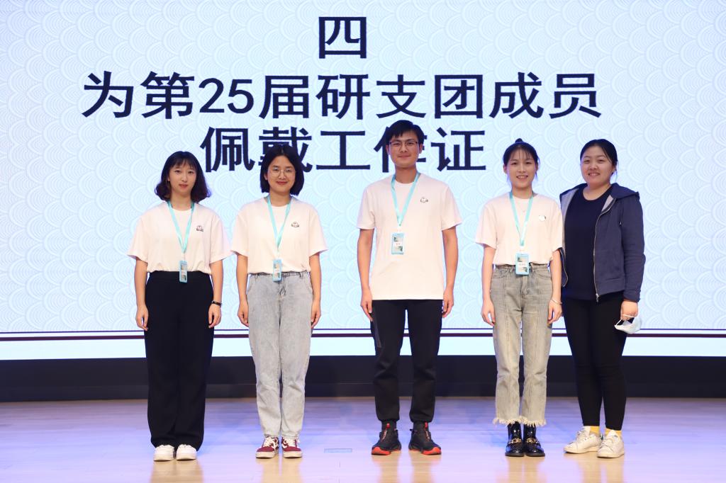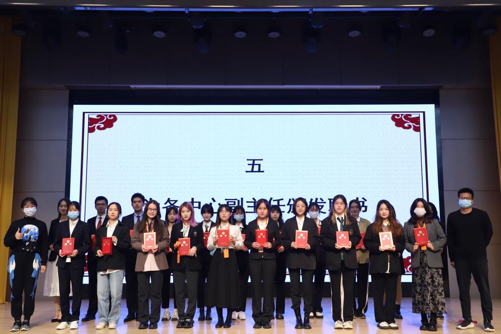邹泺铱老师为2022–2023学年校团委学生副书记李思琦、叶高洁佩戴工作证,颁发聘书;玄铮老师为第二十五届研究生支教团颁发工作证;奚琢老师、闫家轶老师为各中心副主任颁发聘书。