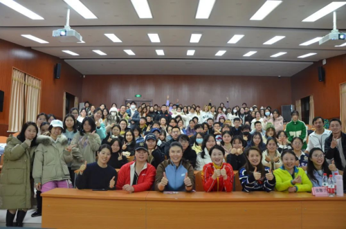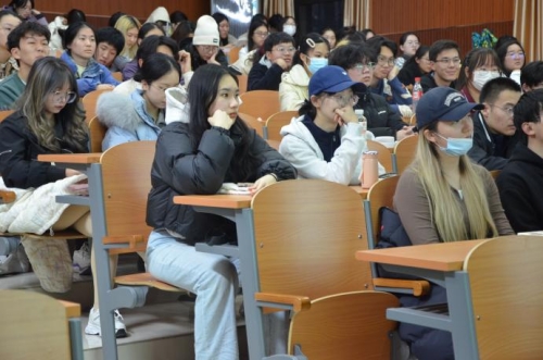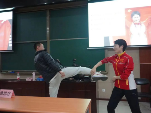 提问环节中,同学们积极提问了有关体育比赛的技巧,吴静钰老师指出找准时机的关键在于练习,在面对实力明显强于自己的选手时,要规避劣势,创造一切机会去赢得比赛,并与韩鹏老师一起示范了跆拳道中的预判动作。