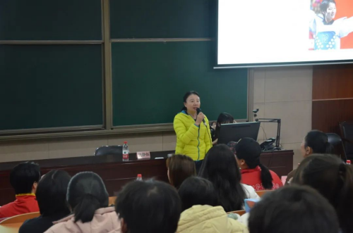 活动伊始,吴静钰老师向大家讲述了她和跆拳道“相识相知”的经历。她自述自己从小就怀抱体育热忱,青年时期在比赛中一举夺冠,坚定了学习跆拳道的信念,进入体校进行训练。数十年如一日艰苦卓绝的奋斗,将她一步步送上了国家队的舞台,并在其中崭露头角。1999—2021二十二年间,吴静钰四度代表国家出战奥运,荣获数枚跆拳道世界奖牌,其中更是两度斩下奥运金牌,在世锦赛、亚运会、全运会的赛场上多次为国争光、加冕桂冠。
