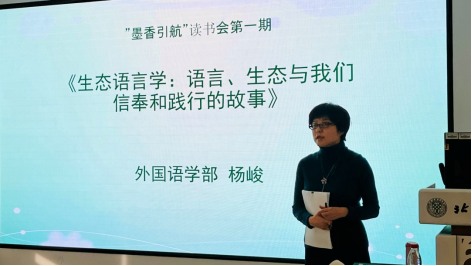 第一期读书会于11月15日上午9时在图书馆日新讲堂举行。本次引航导师为学部副主任、东方语言文化学院院长、博士生导师杨峻教授,研读书目为《生态语言学:语言、生态与我们信奉和践行的故事》。