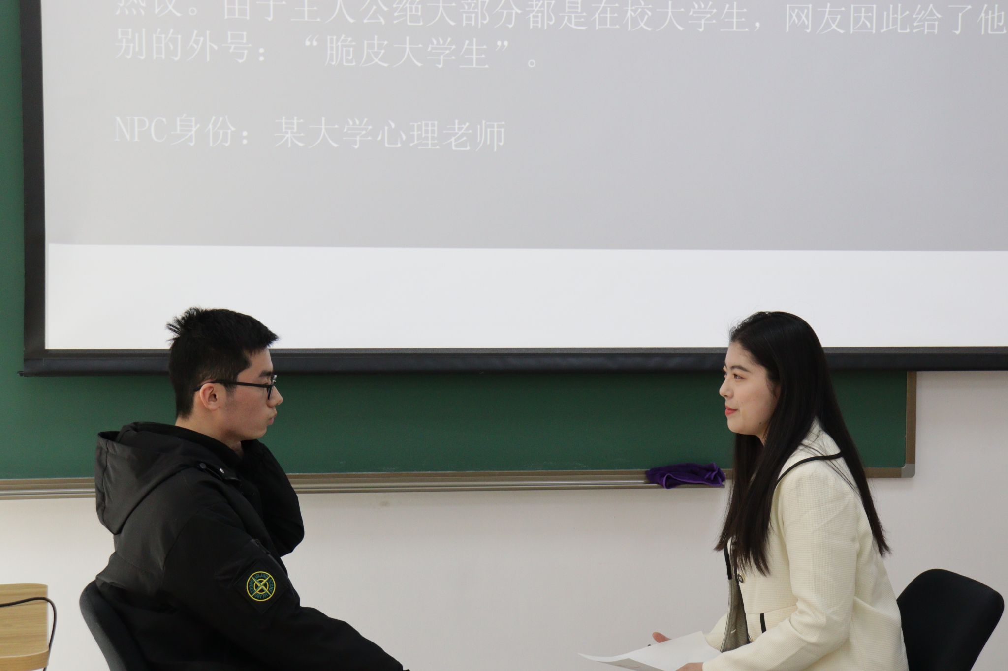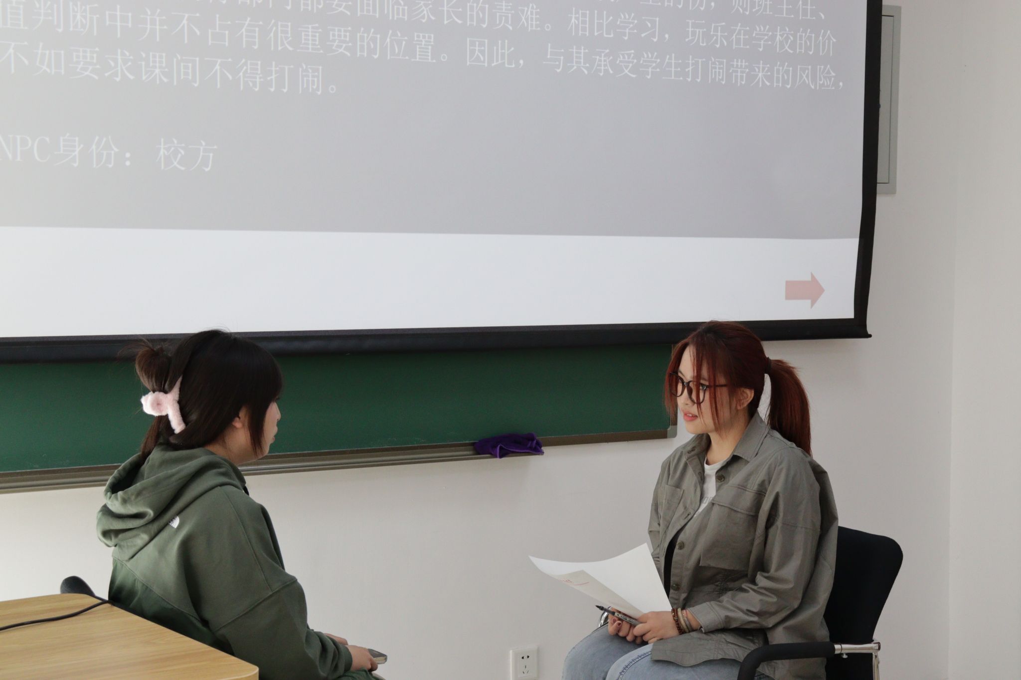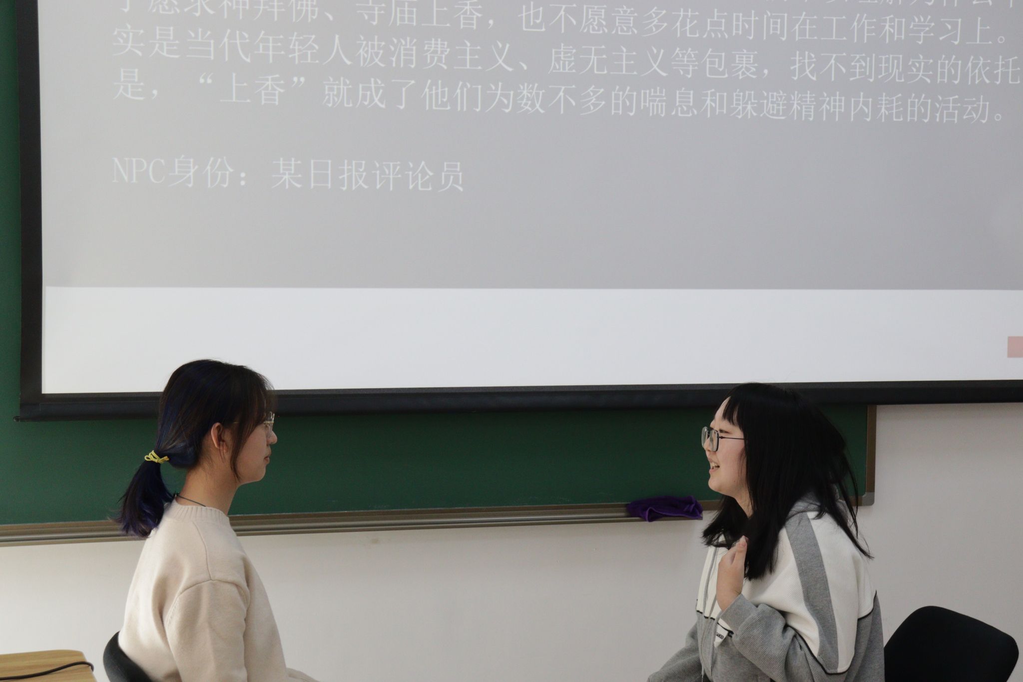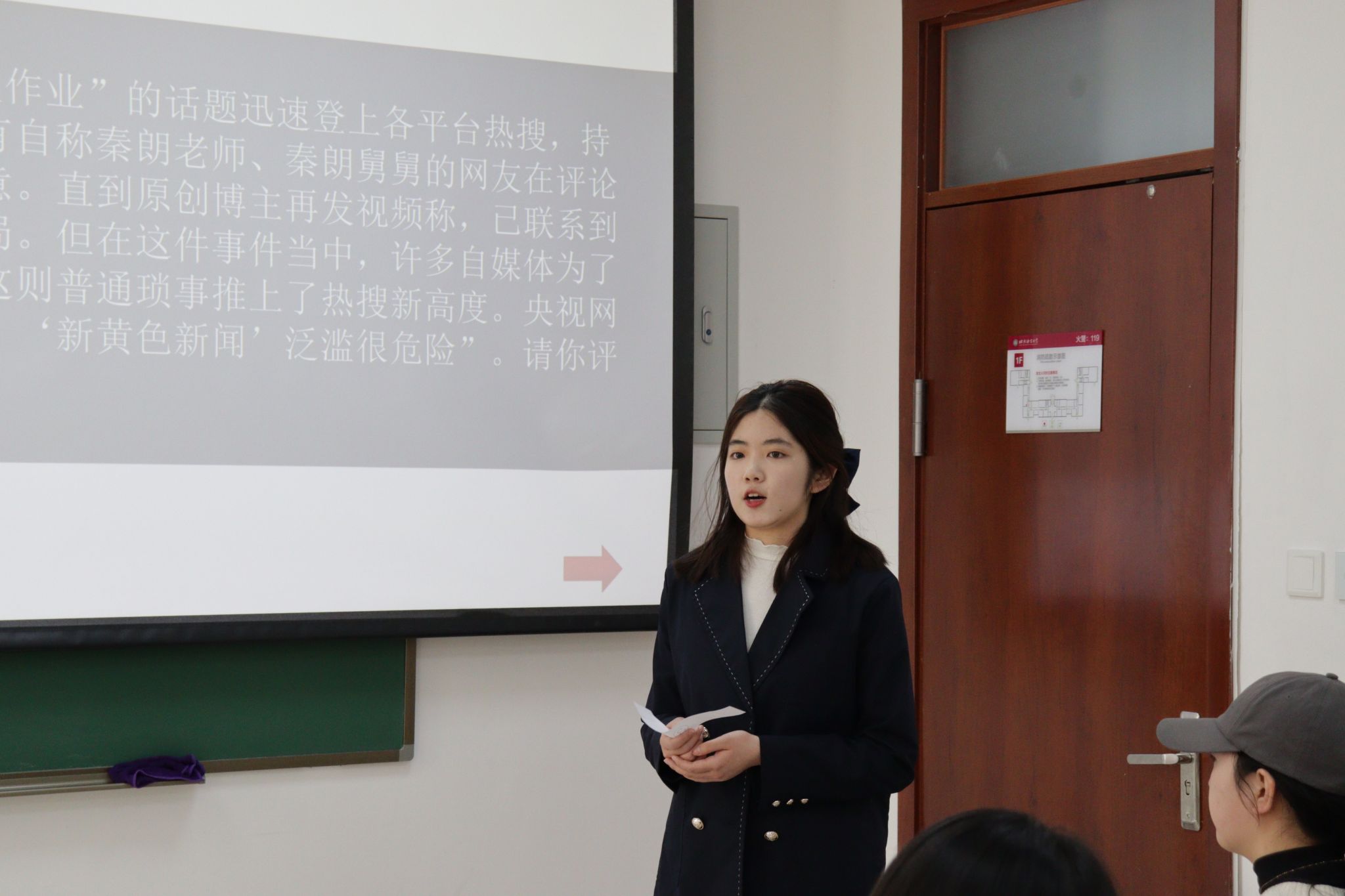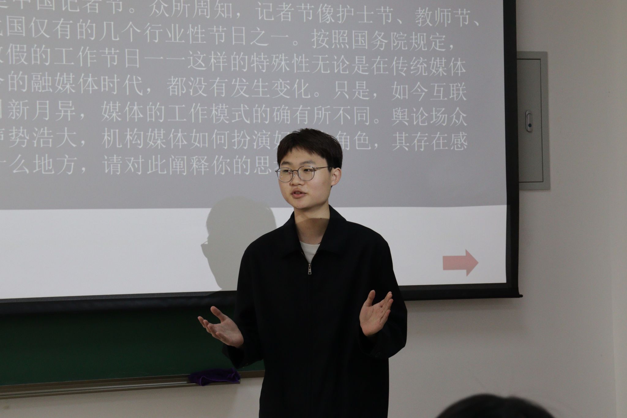 比赛分为两个环节,选手组内决定分工,各自参加即兴评述和情境采访,两个环节先后进行。即兴评述环节,选手们按抽签顺序进入教室比赛,根据所抽取的材料进行限时3分钟的即兴评述。评述材料涵盖众多社会热点事件,选手们就材料中的事件进行了鞭辟入里、独到深刻的分析与评论,充分展现了选手们对社会热点事件的思考与优秀的表达能力。