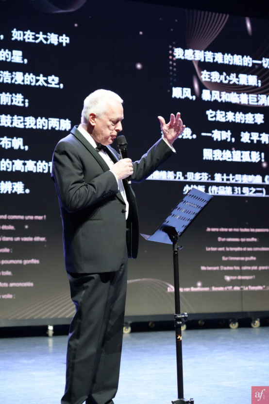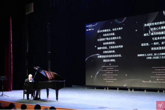 其后,奥利维耶以他的琴键为画笔,绘制出一幅跨越欧洲的音乐地图。他的演奏贯穿了贝多芬、肖邦、德彪西、弗兰克、格拉纳多斯和李斯特几位大师的经典曲目,每一曲都是对欧洲音乐传统的深情致敬,每一首诗歌都将法语和音乐美妙连接在一起。这种音乐与诗歌的结合,引领着听众跨越时空的界限,深刻体验到欧洲艺术的丰富传统和法语文化的独特魅力。结尾的返场曲目——钢琴版《平凡之路》,更是让年轻的大学生唏嘘赞叹,内心共鸣。