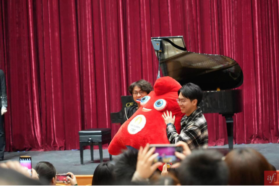 作为钢琴家奥利维耶本次中国巡演的收官之站,“奥利维耶诗歌及钢琴独奏音乐会”当晚,灯光璀璨,观众热情洋溢,会堂内1000多个座位座无虚席。多国使领馆外交官及嘉宾、北京语言大学和北京法语培训中心的师生们齐聚一堂,共同见证了这一音乐盛事。同时,北语即将前往巴黎奥运会的志愿者和奥运会吉祥物弗里吉(Phryge)都来到现场助阵。