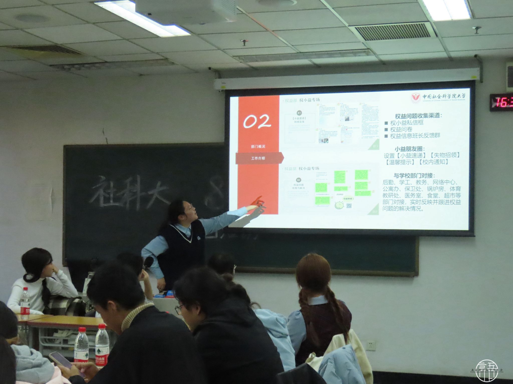 随后,两校学生会代表在教一楼312教室展开交流。双方学生会代表积极分享了各自在组织建设、宣传策划、学生权益维护等方面的成功经验和创新做法。北京语言大学校学生会分别介绍了四个部门的职能和活动,通过丰富多彩的形式,增进了不同国家学生之间的友谊和文化交流。北语商院主席和副书记分享了商学院有关宣传和权益的管理经验,通过定期开设培训课程、邀请知名摄影博主教学等活动,建设了有序的工作制度。中国社会科学院大学校学生会随后分享了六个部门在学术活动组织和思想引领方面的宝贵经验,这些部门在学术活动的策划与执行过程中,充分发挥各自的优势与特长,积极整合校内资源,为同学们营造了浓厚的学习氛围。