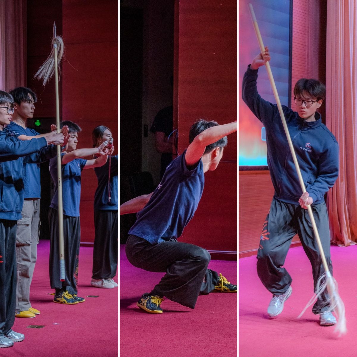 本次联欢会以“百花齐放”为序章,引出“同心逐梦”“破浪前行”和“齐筑未来”三个篇章。联欢会伊始,校武术队带来武术表演《武动乾坤》,诸般武艺齐登场,似百花盛放,耀目华光,为晚会铺垫了热烈的基调。