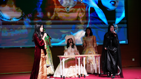 第三篇章开篇,23级国贸班郑东玥同学带来朗诵《月光下的中国》,声情并茂,诵出月光下中国的柔美、厚重与千年的诗意柔情。随后,24级金融1班翟耀雯同学一首独唱《乌兰巴托的夜》,如风中残烛般摇曳着无尽的孤独与深沉的思念,令观众也仿若置身于那片广袤无垠、星子低垂的草原夜空下。24级金融2班陈煜雯等同学带来舞蹈《寄明月》,将传统与现代完美融合,举手投足间尽显古韵新风,洒下一片清辉绮梦。最后,由24级经济班带来的配音合唱串烧《听!是前世“经声”》,声效逼真,各种经典台词情境重现,《稻香》一曲响起,又似回至童年那片无忧的田野,交织成一场震撼视听的盛宴。