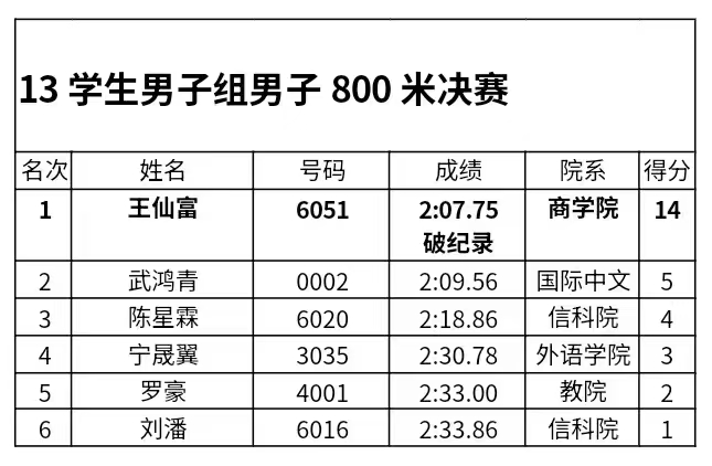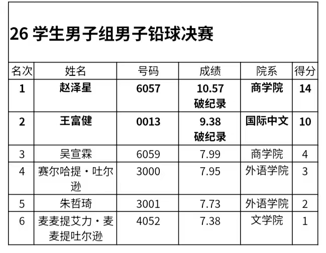 值得一提的是,我院王仙富同学以2:07.75的成绩打破我校男子800米纪录,赵泽星同学以10.57的成绩打破我校男子铅球纪录。