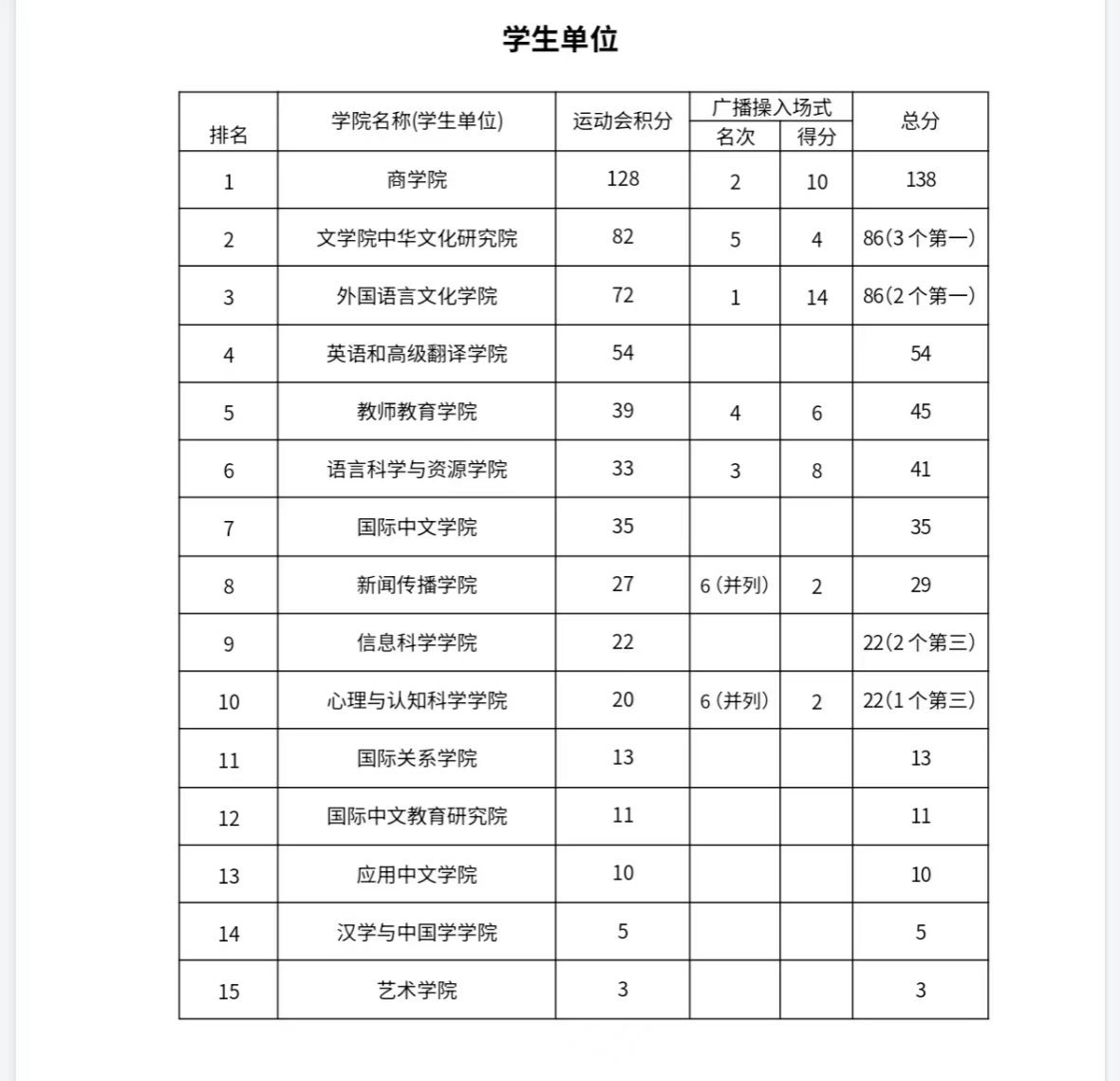 北京语言大学第四十三届运动会圆满落幕,商学院师生在赛场上奋勇争先、突破自我,用汗水和激情谱写了青春华章。本次运动会不仅彰显了商学院团结协作的集体风貌,更锤炼出顽强拼搏的精神品质。让我们将赛场上的昂扬斗志转化为持久动力,在治学与工作中秉承“团结奋进、追求卓越”的体育精神,以矢志不渝的信念开拓更为辉煌的明天!