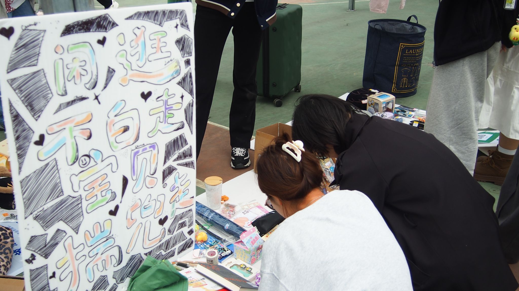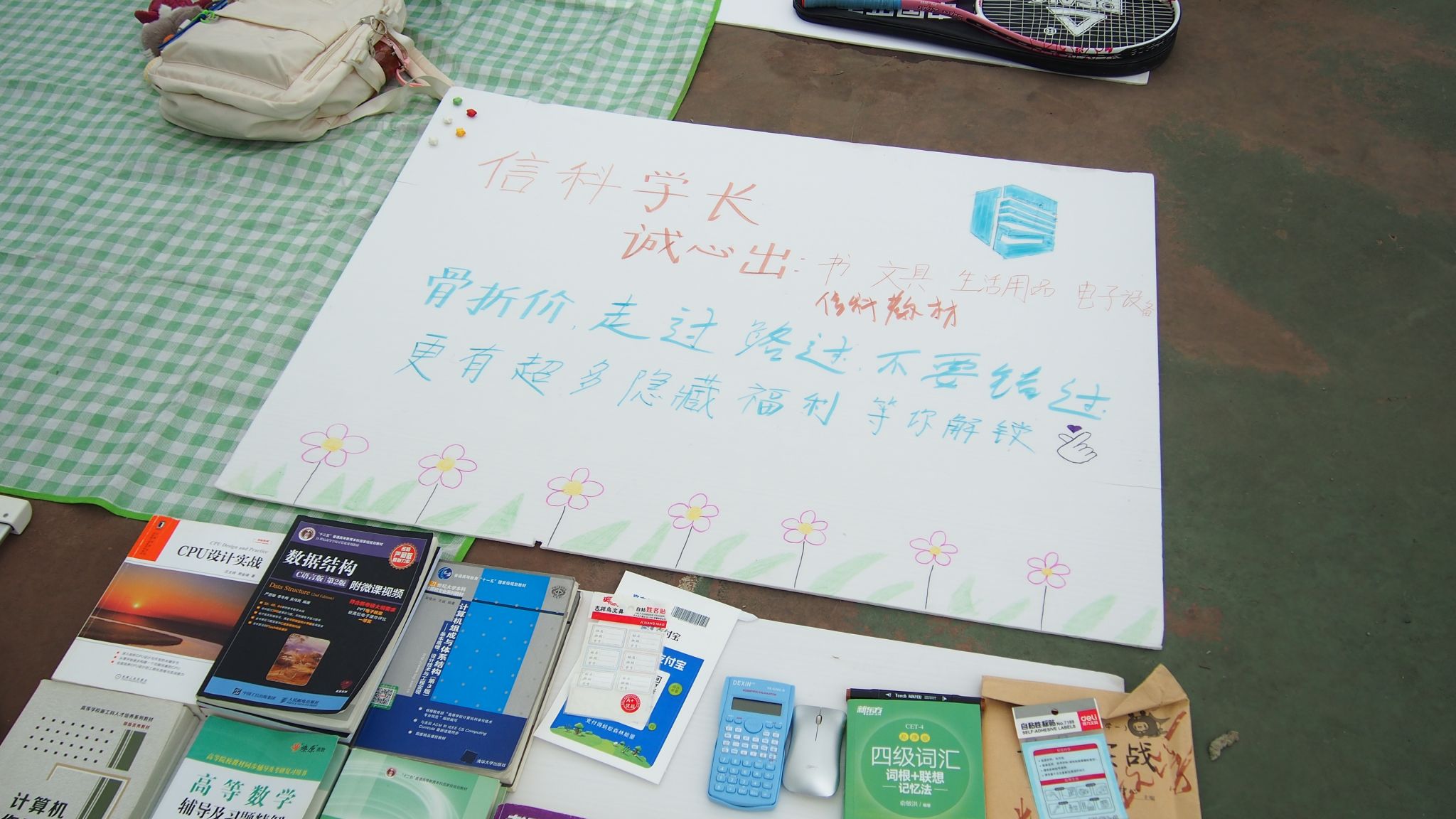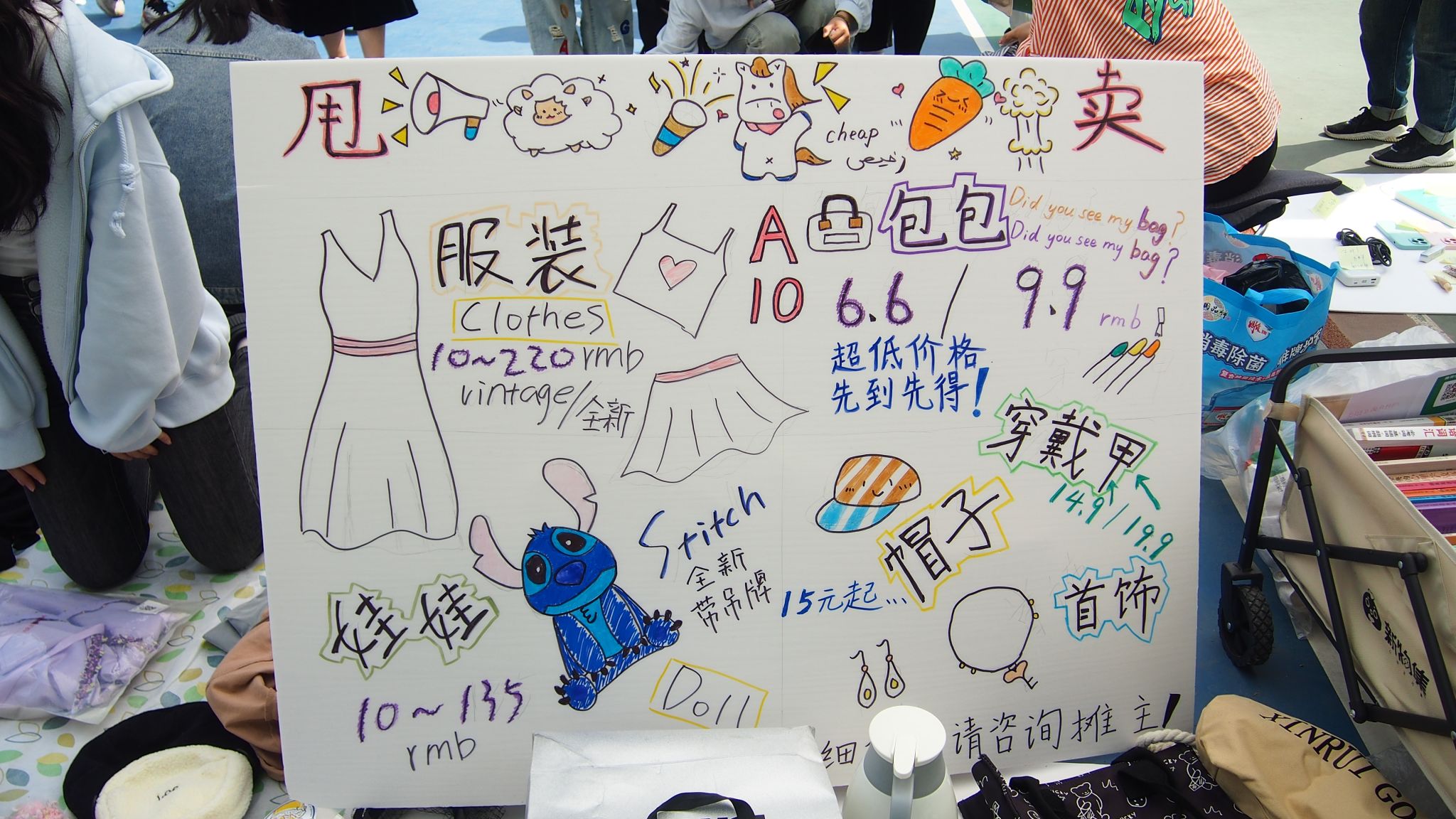 市集里,摊主们精心制作的小展板形成了一道亮丽的风景线,各摊位的揽客标语创意十足、趣味横生。这些展板以图文并茂的形式,展示着摊位上所卖的旧物和促销活动,路过的同学都忍不住停下脚步挑选商。