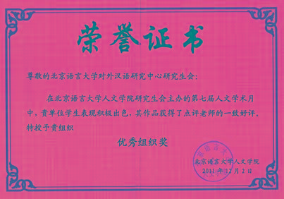 11月4日至12月2日,我校人文学院研究生会主举办了第七届“人文学术月”活动。对外汉语研究中心研究生积极参加此次活动,并有7名同学获奖。活动中,对外汉语研究中心的学生们表现积极出色,作品获得点评老师的一致好评,人文学院特授予对外汉语研究中心研究生会“优秀组织奖”。本届人文学术月共吸引来自北京语言大学、北京大学、中国政法大学、外交学院、北京外国语大学、中国传媒大学、北京师范大学、北京交通大学等多所高校的近百名硕士研究生参加。共分语言学文字学、二语习得、对外汉语教学综合理论、古代文学、古典文献学、专门史、中国现当代文学、文艺学,比较文学与世界文学等11个专场。