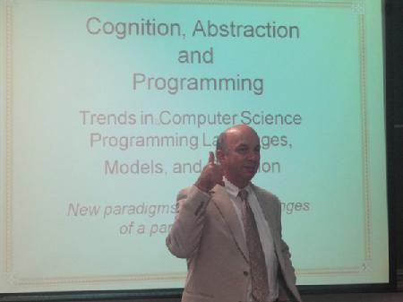 讲座中,Dr. Gregory Guthrie从认知,抽象和程序等方面分别讲述了计算机编程语言的新开发领域。首先他通过几种编程语言之间的比较,分析出高层次的编程语言具有高度抽象性的特点,并提出程序员应如何提高解决程序中抽象问题的能力从而达到提升思维模式,开拓计算机新领域的目的。紧接着,Dr. Gregory Guthrie提出人类的大脑资源是有限的,但通过丰富各种经历能扩展大脑的虚拟空间,所以我们的教育的目的不应该局限于灌输大量的信息,更应该注重培养思考的过程,开发大脑的潜力。最后他强调了未来全世界最好的自然资源将是人类的创造力,并鼓励大家要在培养抽象思维的基础上来学好计算机语言的理论与技术。之后Dr. Gregory Guthrie耐心讲述了我校与马赫西管理大学之间的2+2双文凭本科生培养项目的细节,并针对在场同学提出的疑问,对该校的计算机专业发展做了详尽的介绍,让到场的同学受益匪浅。
