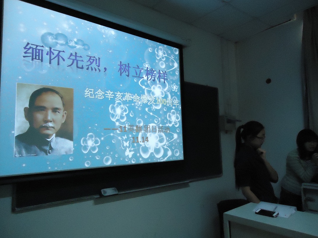 此次团日活动的主题是“缅怀先烈,树立榜样”暨纪念辛亥革民一百周年。团支书首先向大家介绍了此次团日活动的目的与意义,随后,支委向大家介绍了辛亥革命的发展历程。在对辛亥革命有了大致的了解后,团会进入到了高潮阶段——知识问答环节。凭借着高中学习的历史知识以及团会上对辛亥革命的再次了解,团员们积极参与抢答,而且正确率都很高。接下来,所有团员观看了电影《辛亥革命》的片段,学习老一辈革命家舍己为人的大无畏精神。大家带着对历史革命家的崇敬与对革命的热血说出了今后的学习与生活方向。“勤俭、节约、刻苦、多为他人着想……是我们90后奋斗的目标”。