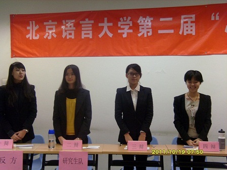 11月10日晚,由校团委指导、社团理事会主办、辩论协会协办的“北京语言大学第二届中文辩论大赛”揭幕战在主楼918教室举行。本次比赛邀请到了2011年国际大学群英辩论会顾问多项京津地区高校辩论赛评委及顾问前辽宁省大学生辩论赛最佳辩手张家鹏老师,中国经济网评论部常务副主任曾任全国大专辩论会节目组策划多项全国及北京地区高校辩论赛事顾问及评委李炎老师,以及国际关系学院辩论队执行教练工行杯首都高校辩论邀请赛最佳辩手第四届学院路辩论赛全程最佳辩手冯若谷老师担任评委。