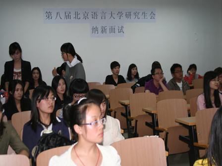 面试者先在教四楼105准备面试,在等候期间内,由第八届校研会主席蔡建永发表讲话并播放介绍研会工作的视频。参加面试的同学则被领至位于教四楼一楼的其他教室,分各部门进行面试。北京语言大学研究生会委员会成员本着严谨负责的态度,以分组面试、单独面试、群体面试等不同的方式对面试者进行提问考察。经统计,共有159人投递了报名表,150人参加了面试。9时30分整场面试在和谐、轻松、有条不紊的气氛中结束,获得了令人满意的效果。