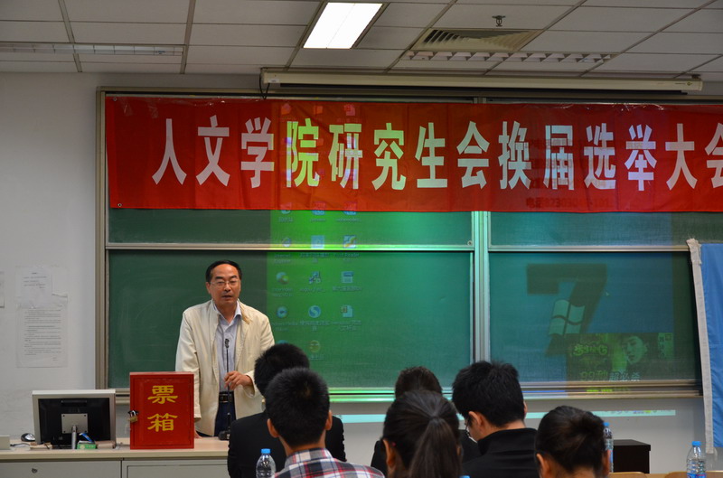 9月19日晚7点,人文学院研究生会换届选举大会在主楼501教室举行,本着公平、公正、公开的原则,投票产生了新一届(第七届)人文研会执行委员会。人文学院副院长王为民、研究生辅导员余蓝老师到场为候选人加油,校研会、各二级学院兄弟单位研究生代表及人文学院各班研究生代表出席。