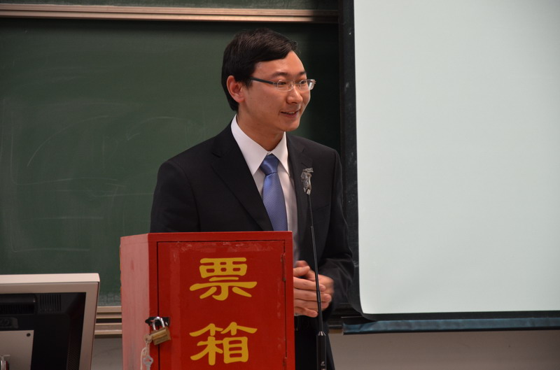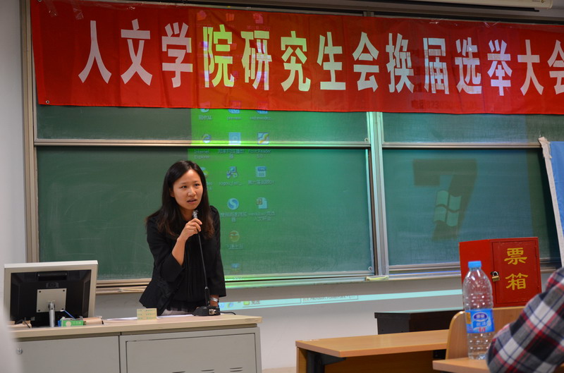 在来自10、11级的17位同学依次发表了竞选演说后,与会代表开始了无记名投票。经过繁忙的统票工作,余蓝老师宣布投票结果,10级课程与教学论专业硕士研究生韦九报高票当选新一届人文研会主席。