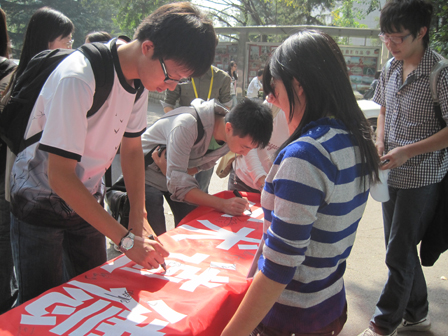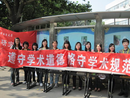 活动由学术部主办,他们早早就在活动地点——北京语言大学主干道上布置会场。写着活动主题的横幅刚摆在桌上,就吸引了很多老师和同学驻足观看,了解情况。12点左右,同学们都下课了,主干道的签名区更是人头攒动,没过多久,横幅前就排起了签名的队伍。同学们认真地在横幅上签上了自己的名字,他们每个人的心中都铭记着自己将担负起遵守学术道德、恪守学术规范的责任。