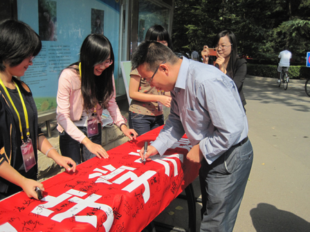 9月23日中午,北京语言大学研究生会举办了以“遵守学术道德,恪守学术规范”为主题的大型签名活动。活动现场吸引了来自各个学院的中外学生,大家有序地排着队伍,庄严地写下了自己的名字。