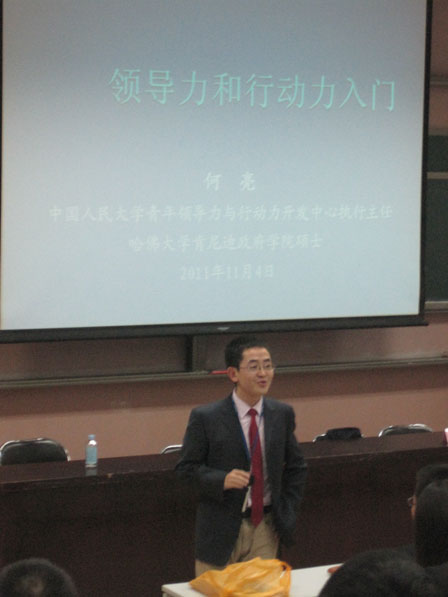 这次会议请到了力德有威教育咨询有限公司总经理,中国人民大学公共管理学院青年领导力与行动力开发中心执行主任何亮老师。讲座以两个石油公司的利润博弈为背景展开,学生每两人一组分别与另一家公司的两位同学进行盈利的博弈。怎样让双方达到利益最大化呢?怎样取得别人的信任呢?怎样有效与别人沟通呢?博弈一开始,各组同学就展开了激烈的讨论,两家公司更是开始了拉锯战似的谈判。游戏结束后,何亮老师从分析几番谈判的要点开始,以小见大,分别向同学们展示了信任和沟通,价值观和领导力,风险承担和可持续发展策略。最后,何亮老师还结合自己在哈佛求学期间作为唯一一名中国籍评审委员参与招生工作所积累的丰富的一手经验回答了同学们的提问。