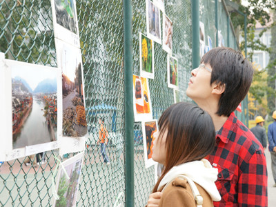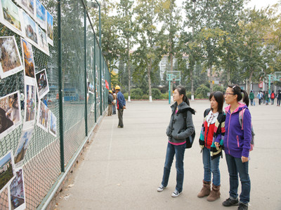 在同学们回宿舍的必经之路上,不论是大一新生还是已经对北京基本熟悉的高年级同学,都期盼的找寻自己家乡的照片,希望能在影展上看到家乡的风景。当看到那些熟悉的景点时,不禁惊喜地喊出他们一心想念也深藏在心底的名字,并骄傲地介绍给身边同学。香格里拉的花、青岛五月的风、南宁的中山路和南湖、杭州的西湖等。美丽的风景唤起同学们对家乡的思念。在随后的两天,主办方又将照片组中文字“家”的形状挂在篮球场的护栏上,这一组照片以国外风景为主,新西兰的羊、俄罗斯的鸽子、澳大利亚的海。这些都吸引了中外学生的围观欣赏。