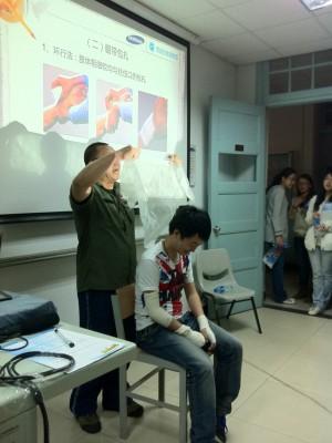 图片一 吕老师邀请志愿者上台配合演示绷带包扎