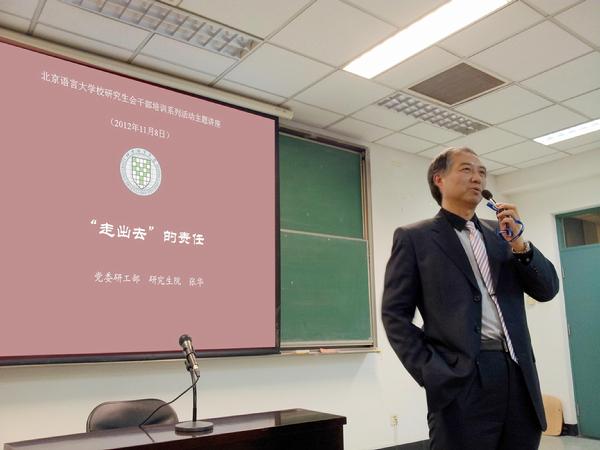 11月8日晚,北京语言大学第四期研究生干部培训开班典礼正式拉开帷幕。本期开班典礼特邀请到党委研工部部长、研究生院常务副院长张华教授为研究生做主题讲座——“走出去”的责任。校研究生会全体成员及各培养单位研究生会代表参加了本次开班典礼。