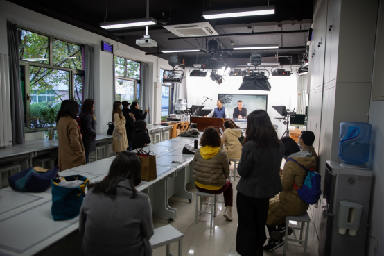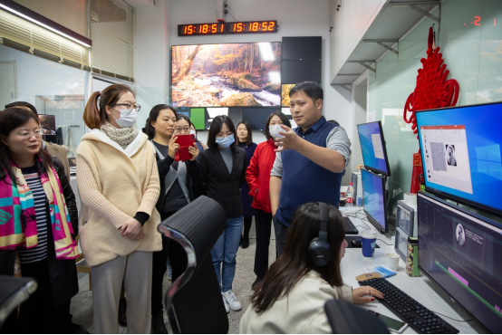 参访教师在了解慕课拍摄、后期编辑等流程后,前往制作中心的演播室体验了课程录制过程。有的老师体验了实景布景拍摄,有的老师体验了基于提词器的虚拟背景拍摄,有的老师则在导播室体验了导播视角。随后,参访教师交流了作为录制者和被录制者的体验感受,认为学校新投入使用的“北语慕课制作中心”为教师的慕课录制提供了的技术和场地保证,调动了教师参与线上教学改革的积极性,为加强一流课程和一流专业建设打下了良好基础。