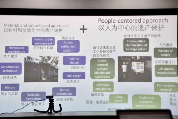 刘明谦老师的发言题为“遗产保护中的社区参与”,以其博士论文《东四居民对历史文化保护街区保护政策和实践的感知研究》的研究成果为案例,指出了政府主导的对历史建筑环境的解释和保护与居民的价值观和日常需求不同。只有让社区居民参与进保护工作,文化遗产才能真正地得到保护。