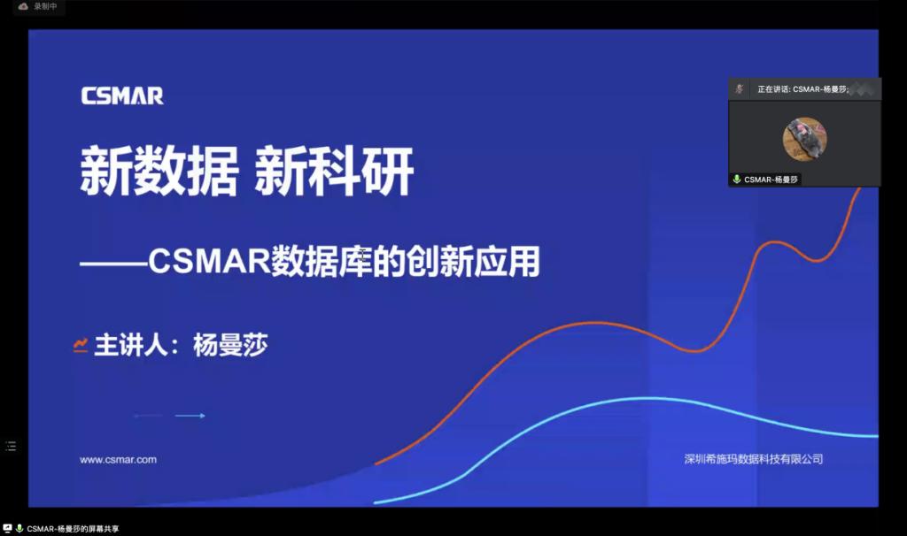 为迎接60周年校庆,促进学术交流,营造浓厚学术氛围,4月15日,北京语言大学商学院举办“双周学术论坛”系列活动第七场。本次论坛邀请到了深圳希施玛数据科技有限公司高级研究员杨曼莎老师为大家带来了题为“新数据,新科研——CSMAR数据库的创新应用”的线上专题讲座,并实时解答师生们关于讲座内容的提问。此次线上参与讲座人员多达130余人次,同学们热情高涨,踊跃提问,收获颇丰。