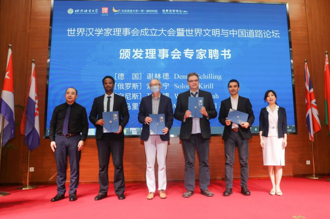 北京语言大学人事处处长郁有学、北京语言大学科研处处长张健为德国汉学家谢林德(Dennis Schilling)、俄罗斯汉学家索罗宁(Solonin Kirill)、突尼斯汉学家瓦利德(Walid Abdallah)、索马里汉学家伊斯曼(Abdilahi Ismail Abdilahi)颁发了理事会专家聘书。