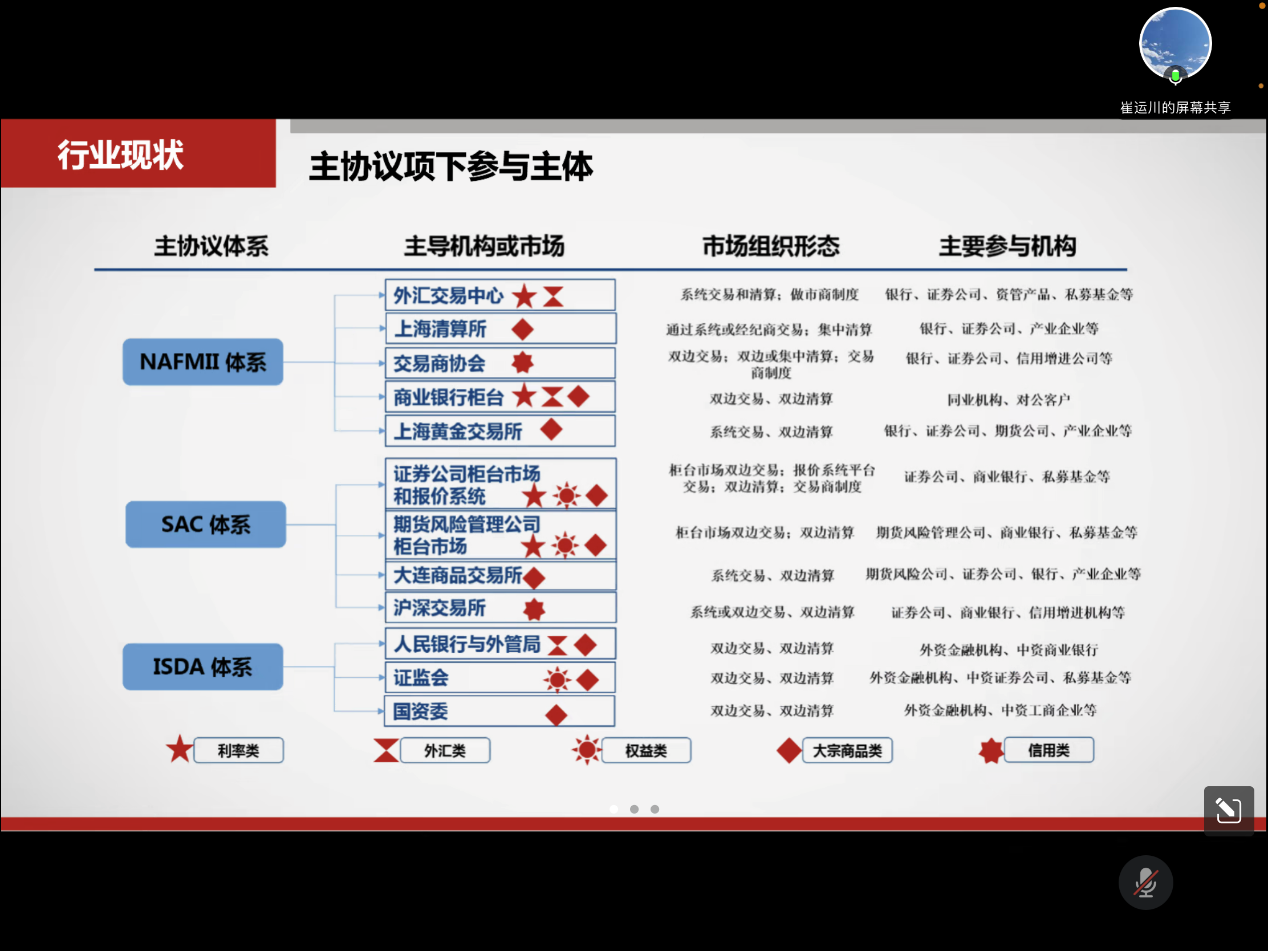 崔运川老师首先从目前国内场外衍生品的行业现状引入,刻画了衍生品市场主要由银行间场外衍生品市场、证券期货场外衍生品市场以及外资机构柜台场外衍生品市场组成的格局,并介绍了各类主协议体系和证券与期货公司的业务流程。随后,崔老师对场外期权的业务概览、期权交易概况以及各类奇异期权分门别类进行了详尽的讲解,并结合希腊字母说明了各类期权的对冲策略。收益互换业务以及收益凭证也是场外衍生品的重要组成部分,崔老师结合实际操作为大家介绍了此类业务的流程。