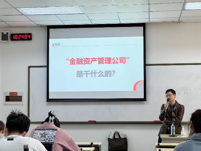 刘雨施老师首先抛出“金融是什么”这一问题,从而引出对金融资产管理公司、金融资产和不良资产的讲述。随后,刘雨施老师结合自身多年工作经验,从资产的收购、资产的处置、债券的估值与分析、不良资产的风险控制等方面为同学们介绍了金融资产的经营与管理。资产的处置包括几种常见模式,分别为依法收贷、混合型债务重组、以物抵债及抵债资产处置和破产重整(含和解),此外资产处置还有资产证券化、债转股重组、资产置换和破产重整几种创新的处置方式。紧接着,刘雨施老师结合实例生动地为同学们讲述了资产管理公司的运作模式和对不良资产的处置,并结合时代发展和自身职业路线对同学们的求职提出中肯的建议。